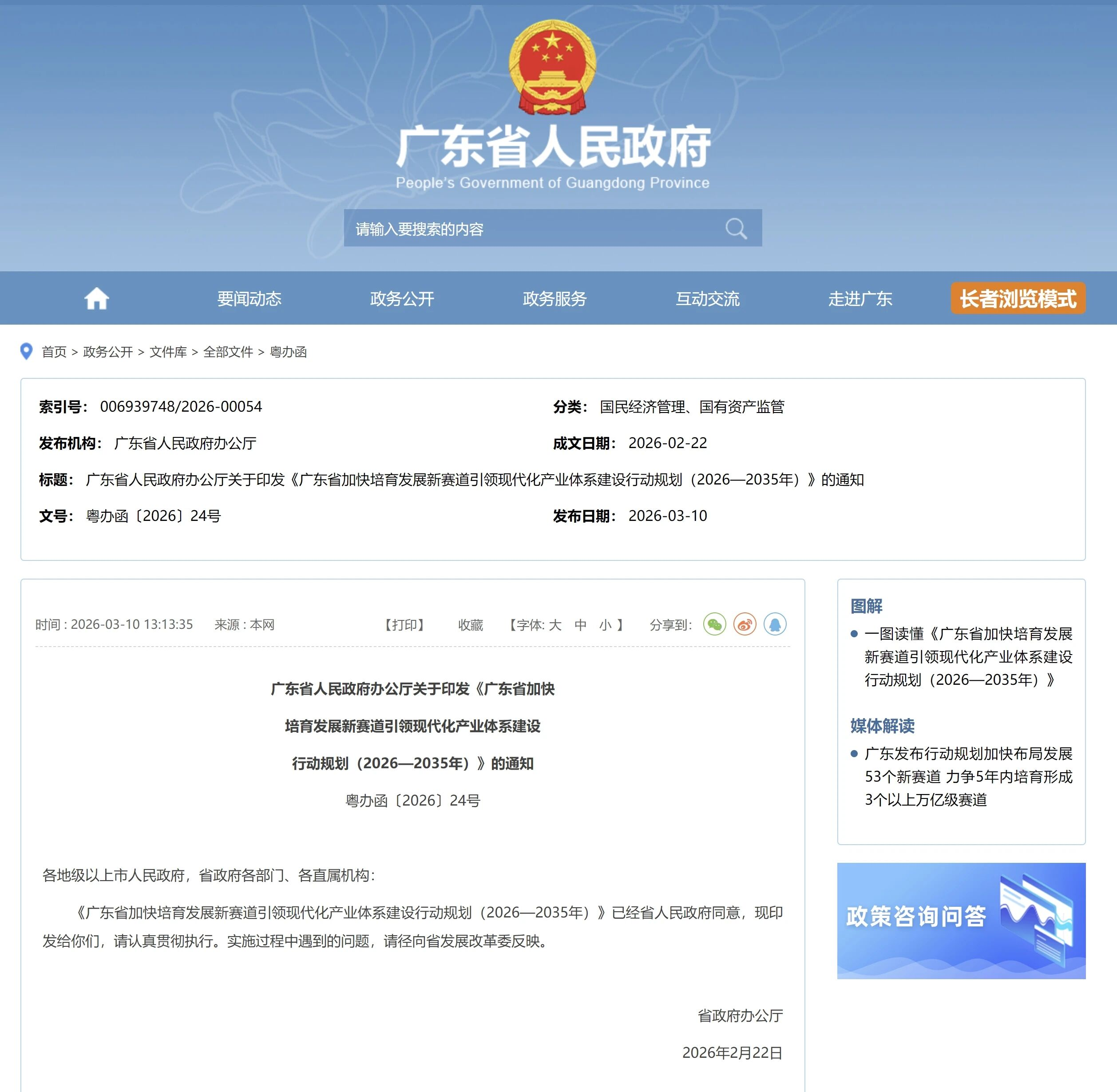 2026年3月10日,廣東省人民政府辦公廳重磅發布《廣東省加快培育發展新賽道引領現代化產業體系建設行動規劃(2026—2035年)》(以下簡稱《行動規劃》)的通知。